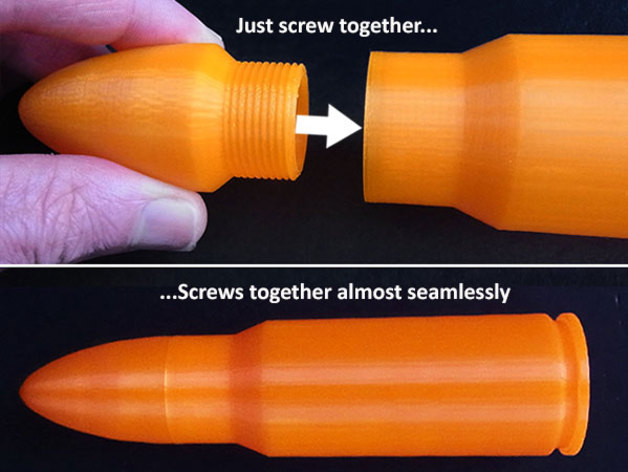 子彈(帽)和墨盒(容器)分開打印。墨盒高11.5厘米,可以在像MakerBot Mini這樣的小型機器上輕松打印。當子彈和彈藥筒擰在一起時,成品約為。16厘米高
