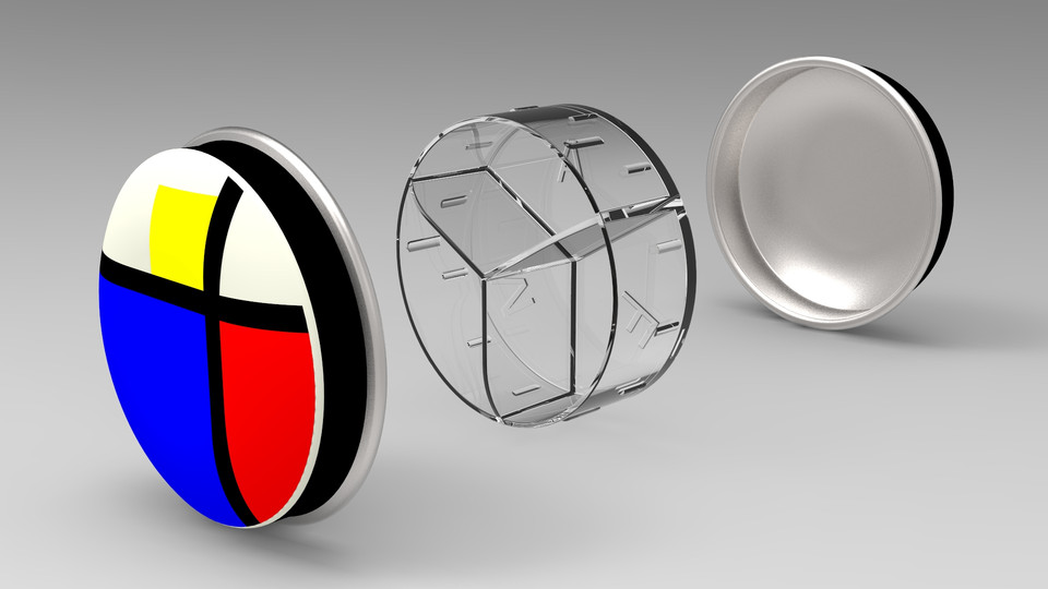 一個由塑料插入件“ps”和兩個由鐵磁性鋼制成的深拉板金屬部件組成的三部分柱狀物——簡單但具有裝飾性——內側面有陽極氧化。