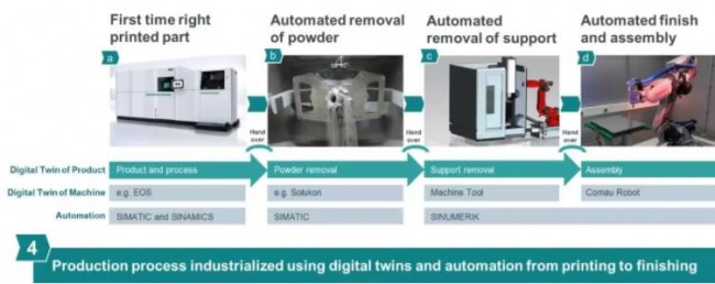 在漢諾威工業(yè)博覽會上,西門子推出了使用數(shù)字雙胞胎成功實現(xiàn)這一轉(zhuǎn)型的第一步。與實際3D打印過程一樣,這包括整個增材制造生產(chǎn)鏈的工業(yè)化以及所有后續(xù)工藝步驟的“可視”化與可預測化。未來,西門子將創(chuàng)建可擴展的模塊,以便從小批量生產(chǎn)到批量生產(chǎn)鋪平道路。