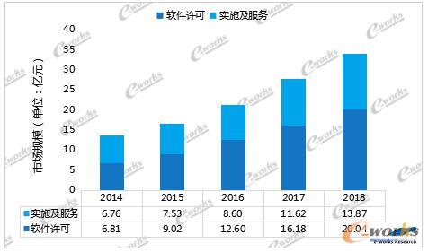 2014至2018中國MES軟件許可、實施及服務市場規模