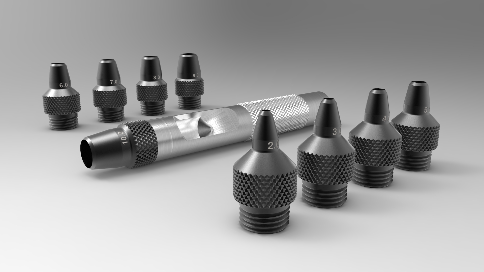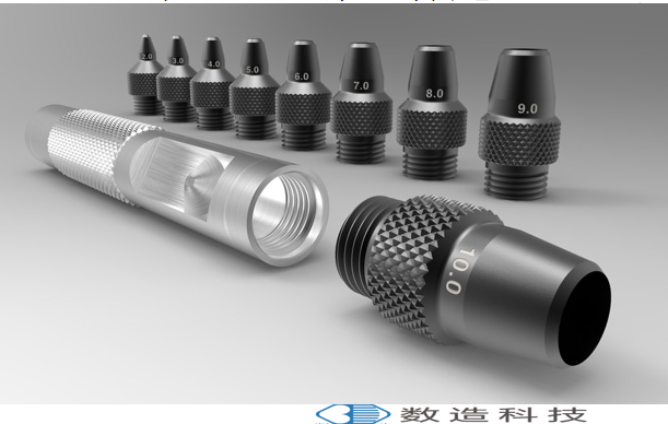 一套空心沖床,由“10”部分組成,其中1部分是標記沖壓件,“9”部分是可變插入沖壓工具,直徑2至10毫米。 沖壓工具有非標準的計量螺紋,用于旋入標記印章。 螺距: 1.35 mm 螺紋的模型沒有間隙。