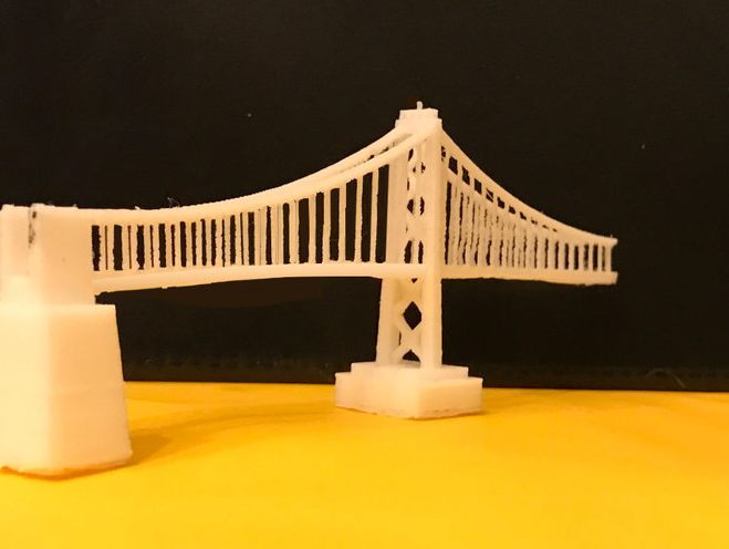 這是在OpenSCAD設(shè)計(jì)的舊金山海灣大橋的一個(gè)3D模型,它是3D打印的。所有較小的功能,如電纜和橫梁支架都已經(jīng)被制造出來(lái),以便在切割時(shí)能夠被提取出來(lái)。