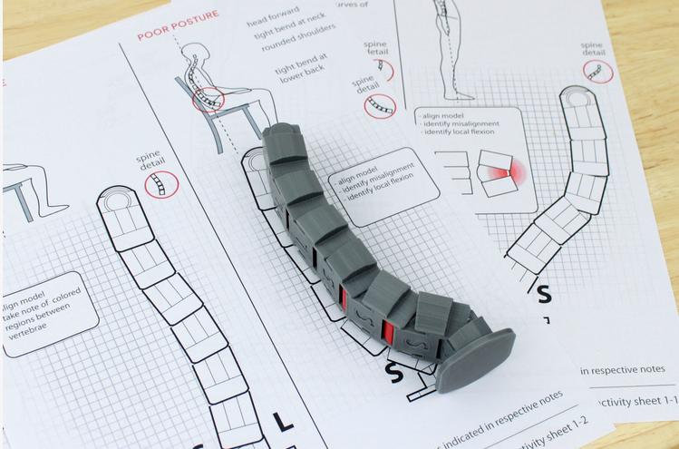 可打印3D打印模型以匹配打印的工作表圖,這些圖是良好和不良姿勢下脊柱的常見形狀。當模型不對齊時,椎骨之間的紅色區域顯示不均勻,清楚地表明問題區域在哪里,可以在課程中解決。