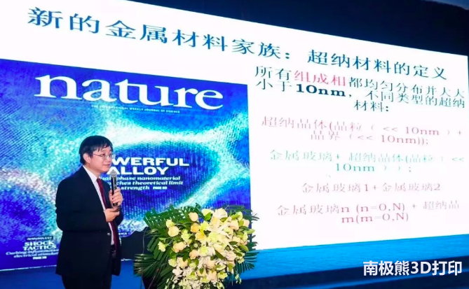 超納材料是用PVD做的,也是一種增材制造,來源于液態金屬或者金屬玻璃的材料。金屬玻璃是一種非常好的3D打印材料,但是最大的問題是太脆了,它和普通的玻璃是一樣的。經過近幾年一系列的研究,我們在金屬玻璃的增韌領域取得了很大的發展,發展了一系列的方法和新型材料。去年我們推出了一個新型的金屬材料家族,即超納材料,也在《Nature》雜志上獲得了中國結構材料領域首篇封面文章,也是去年中國科學家在《Nature》雜志上52個期刊里發表的唯一一篇封面文章。