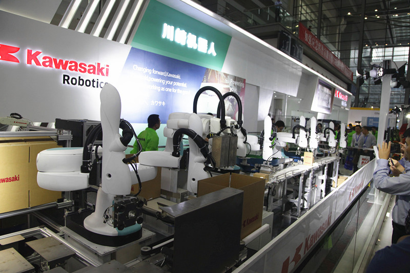 面向華南地區3C行業的龐大需求,川崎機器人的7臺雙臂協作機器人duAro紙板箱生產線精彩出展。采用川崎兩種型號共7臺duAro雙臂機器人作為生產線主體,實現了紙板箱的折疊、裝盒、折蓋、物流轉運裝箱和裝箱、碼垛等操作工藝,為電子產品包裝行業廣泛應用。現場力傳感綜合應用單元、3D視覺自動拆垛單元等多套應用更是各領風騷。