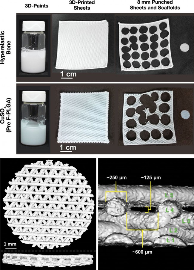 上圖:超彈性骨和硫酸銅(CuSO4)材料,以及具有8mm直徑的3D打印支架 ;左下圖:8mm直徑超彈性骨支架的微計算機斷層掃描重建(自上而下和橫截面視圖); 右下圖:微型計算機斷層掃描截面圖的細節(jié),突出了相關的尺寸和特征。