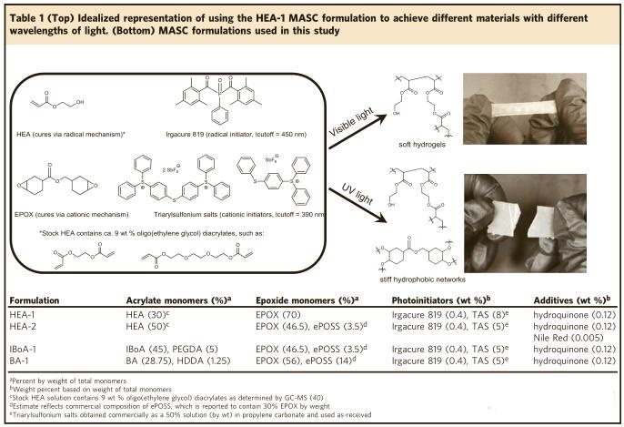 在光固化領域,威斯康星大學麥迪遜分校的科學家開發出一種新型3D打印機,它擁有可見光和紫外光兩種模式,可以同時打印多種光敏樹脂材料。該方法利用多材料光固化空間控制(MASC)技術,在增材制造過程中根據不同的材料化學成分選擇不同的光源波長。多組分光敏素包括具有相應的自由基和陽離子引發劑的丙烯酸酯和環氧化物基單體。在長波長(可見光)照射下,觀察到丙烯酸酯組分的優先固化。在短波長(UV)照射下,摻入丙烯酸酯和環氧化物組分的組合優先固化。這使得能夠生產含有硬質環氧化物網絡的多材料部件,與軟水凝膠和有機凝膠形成對比。 MASC配方的變化極大地改變了打印樣品的機械性能。使用不同MASC配方打印的樣品具有空間控制的化學不均勻性,機械各向異性和空間控制的膨脹。圖1為使用BA-1 MASC制劑打印的樣品的壓縮測試應變圖,表1為光敏樹脂配方。