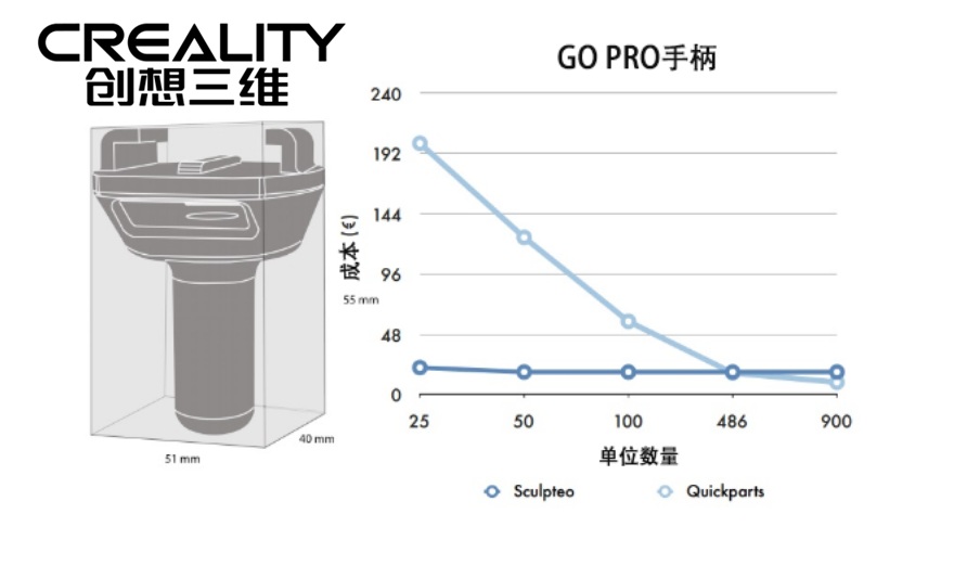 傳統(tǒng)的制造工藝,如成型和注射成型,更適合大規(guī)模制造,而3D打印適合更經(jīng)濟(jì)的小批量制造。下表比較了通過(guò)注射成型(快速零件)制造Go Pro手柄與選擇性激光燒結(jié)(雕刻)相比的每單位估計(jì)成本。在這種情況下,對(duì)于前486個(gè)單元,3D打印仍然是一個(gè)經(jīng)濟(jì)有效的選項(xiàng)。